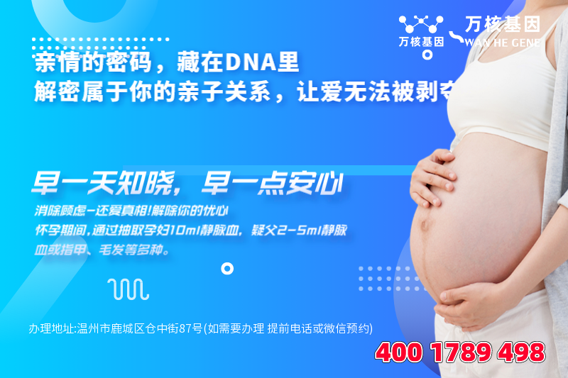 温州亲子鉴定基因检测中心,是一家专为温州周边城市地区服务的亲子鉴定咨询机构,温州无创胎儿亲子鉴定办理地址:温州市鹿城区仓中街87号(如需要办理 提前电话或微信预约)-预约电话:4001789498。